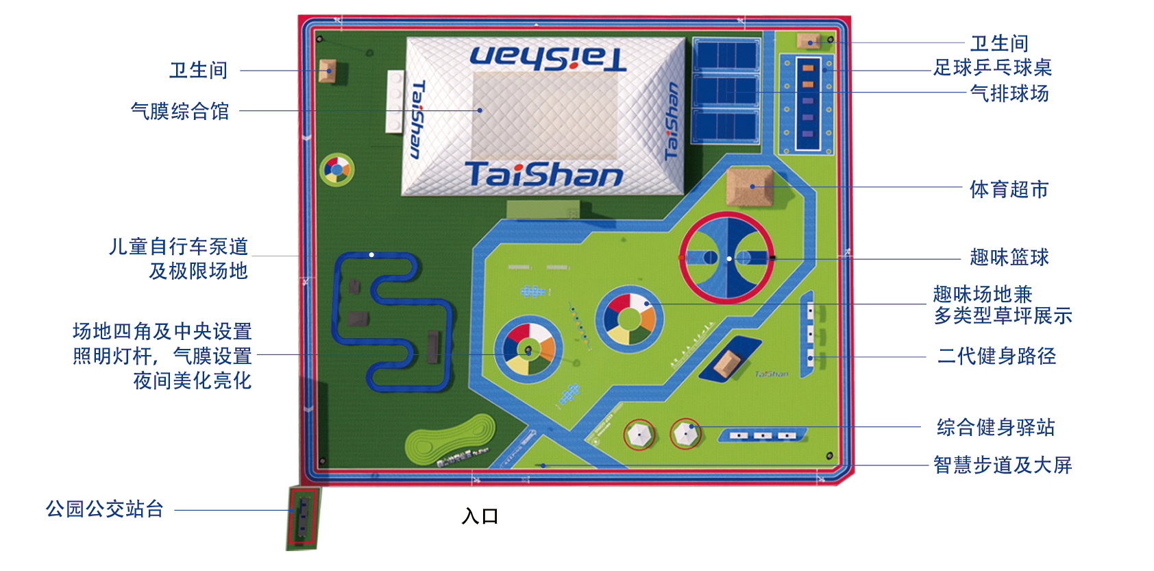 在场地铺设上,均采用泰山新材料功能人造草铺设,全方位保证运动安全和环保;气膜式篮球综合运动馆,内部设置2片篮球场、6片乒乓球场地及1片网球场。网球场同时套线4个羽毛球场地。场馆内可以满足体育运动,体育教学及群众比赛需求。从场馆到运动超市、智慧体测小屋,全部采用可装配式建筑。